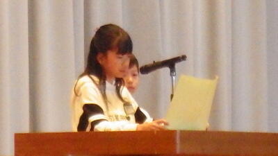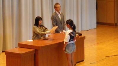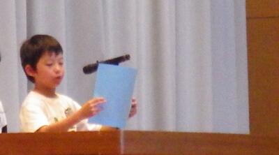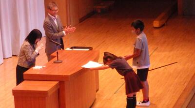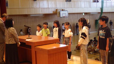 表彰式の後は、1学期の終業式です。2年生・5年生の代表児童が、1学期を振り返って作文を発表しました。校長からは1学期の頑張りを褒め、「一生懸命はすばらしい!」という話をし、加えて「ルールやマナーを守る練習は小学生のうちに」という話をしました。
