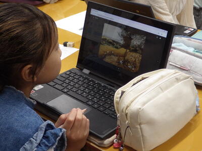 絵画の鑑賞では、大型テレビのモニターで見た後に各自のタブレットで拡大しながら隅々まで見て、何が描いてあるのか、それを見てどう思ったかなどをワークシートにメモします。友達の発表を聞いて、「自分は気付かなかったものが見えている」「自分とは違う感じ方がある」などの感想をもったようです。