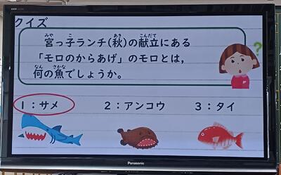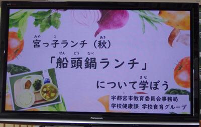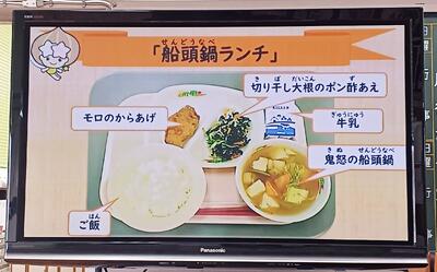 今回の船頭鍋ランチは、その昔、鬼怒川が物資の運搬に重要な役割をはたしていたことや、食材をおいしく食べるための先人の知恵を知ることのできる献立です。お昼の校内放送では、クイズなどを交えながら楽しく今日の献立について学びました。