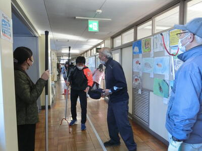 放送が入ると子供たちは教室のドアを閉めて机でバリケードを作り、身を潜めて待ちます。子供たちの安全を確保し、複数の教職員が「さすまた」を持って不審者を取り囲んで抑え込むという内容です。高島様からは「今日の雀央小の訓練はとてもよくできていた」とお褒めの言葉をいただいています。