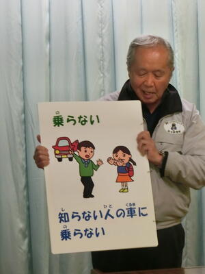 訓練後には、校内テレビ放送で宇都宮南警察署スクールサポーター高島様の講話があり、「いかのおすし」の合言葉について確認しました。「いかのおすし」は、不審者に遭遇したら「(ついて)いかない」「(車に)のらない」「おおごえをだす」「すぐにげる」「(大人に)しらせる」の頭文字を取ったものです。