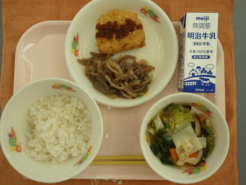 今日の給食 校内給食週間(群馬献立) 投稿日時 : 14:08 雀宮東小学校管理者 麦入りご飯 牛乳 ソースかつ こんにゃくのヒリヒリ煮 おきりこみ {{options.likeCount}} {{options.likeCount}}