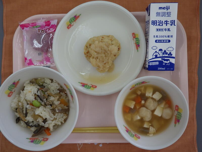 今日の給食 投稿日時 : 13:23 雀宮東小学校管理者 〇こんだて お彼岸献立 五目ご飯 牛乳 豆腐ハンバーグ 大根おろし おくずかけ 桜餅 {{options.likeCount}} {{options.likeCount}}