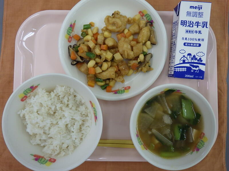 今日の給食 投稿日時 : 11/25 雀宮東小学校管理者 〇こんだて 麦入りご飯 牛乳 鶏肉と大豆の味噌炒め けんちん汁 {{options.likeCount}} {{options.likeCount}}