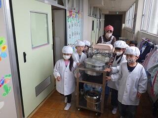 給食当番さんも白衣を着て、上手に給食を分けてくれました。