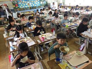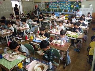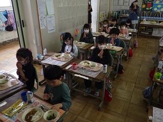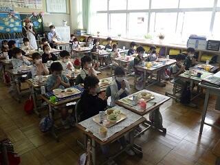 今日の献立は、チキンカレーとこんにゃくサラダ、牛乳と、お祝いゼリーです。お祝いゼリーは1年生の初めての給食に合わせて、入学おめでとうのデザートです。みんな、おいしいと言って、食べてくれました。