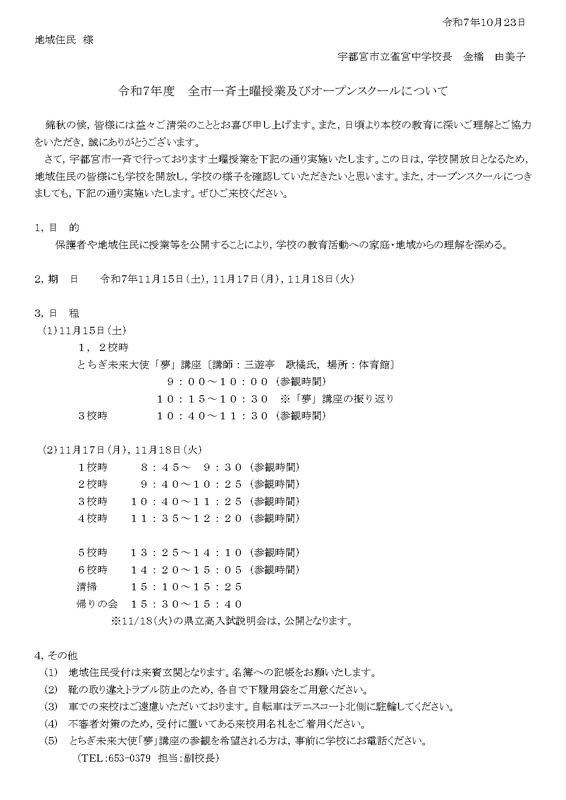 全市一斉土曜授業及びオープンスクールについて