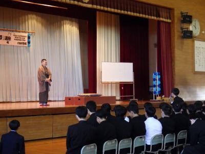 歌橘師匠は、ご自身の学生時代から落語家を志し、厳しい修業を経て真打として活躍されるまでの道のりを、ユーモアを交えながら、そして熱意をもって語ってくださいました。生徒たちは、師匠の軽妙な語り口に引き込まれ、終始真剣な表情で耳を傾けていました。また、講演の最後には落語も披露していただき、会場は大きな笑いに包まれました。