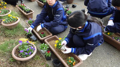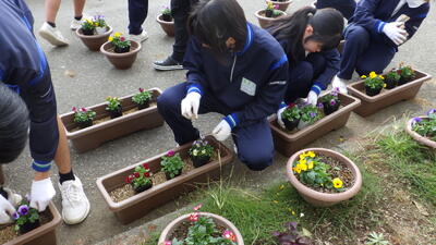 生徒のボランティアが,校内の花いっぱい運動を行うなど,生徒の自主性を育んでいます。