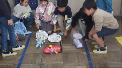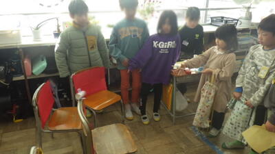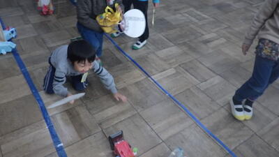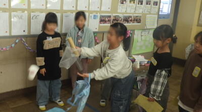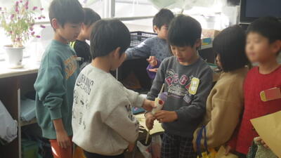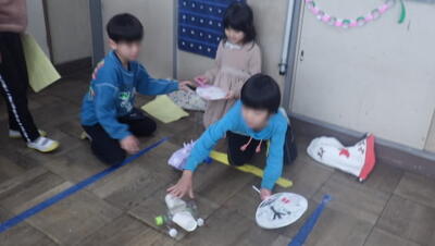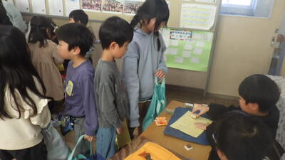 2年生が作ったおもちゃを使ったゲーム屋さんを1年生が回ります。