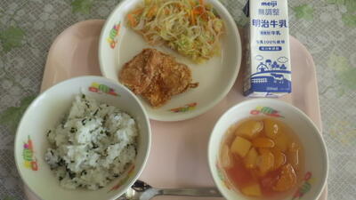 メニューは、わかめご飯、牛乳、とり肉の唐揚げ、春雨サラダ、フルーツポンチです。