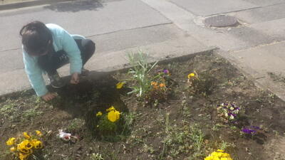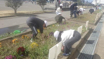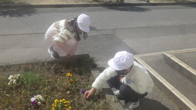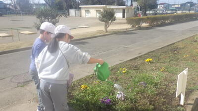 いきいき班ごとに植えた花壇を、当番の学年が水遣りや草むしりなどのお世話をしています。