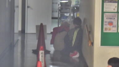 廊下を歩いていた児童は、壁に寄って、上着で頭を守っています。