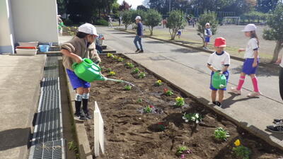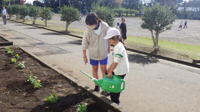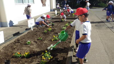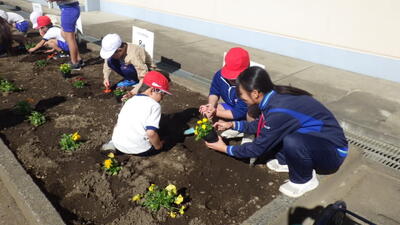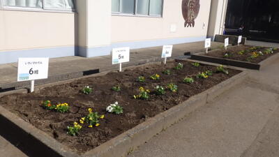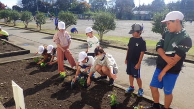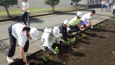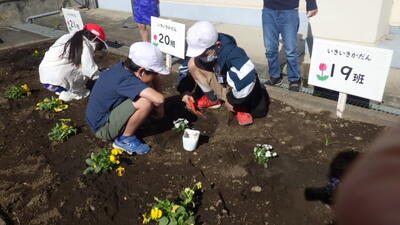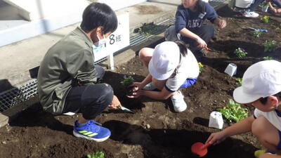 いきいき花壇は、いきいき班(1~6年生の縦割り班)で管理しているので、植え替えもいきいき班ごとに行います。