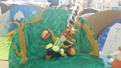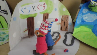 段ボールに描いた背景と紙粘土で作っていたのはお話の一場面。