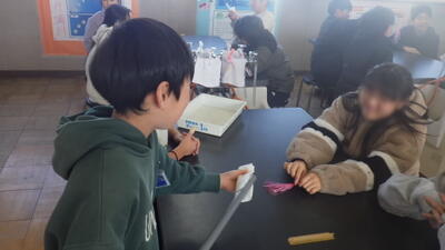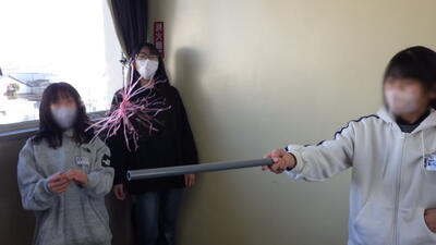 理科の授業では、ビニルひもと塩化エチレンパイプを使って、「静電気の性質」を探るための実験を行いました。