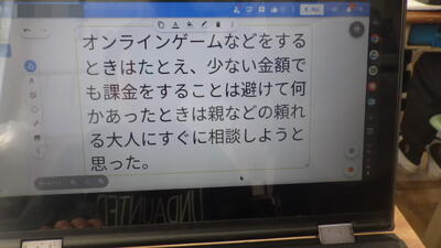 家庭科では、オンラインゲームへの課金の危険などについて教えていただきました。