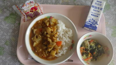 今日は茨城県の料理、れんこん入りツェッペリンカレー・海藻サラダ・さつまいもとくりのタルトです。