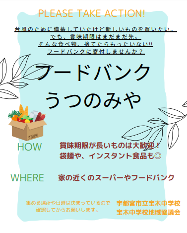 11月22日(金)生徒会執行部より、お昼の放送でフードバンクへの協力のお願いがありました。写真を用いて分かりやすく説明がありました。また、コミュニティーセンターにも生徒作製のチラシを持ち込み、地域の方へも呼びかけをしました。ボランティア活動にも取り組みます。生徒の自主的、意欲的な取り組みにびっくりです。