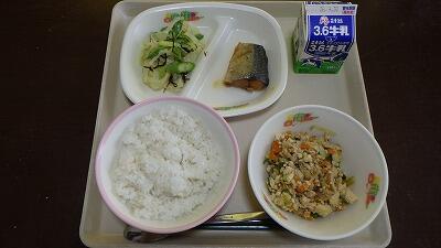 麦入りご飯・さばの味噌煮・アスパラの塩昆布あえ・炒り豆腐