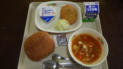 セルフコロッケバーガー(ごまバンズパン・コロッケ・キャベツ)・牛乳・ABCスープ(ミネストローネ版)・セノビーゼリー
