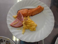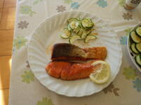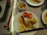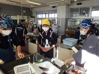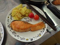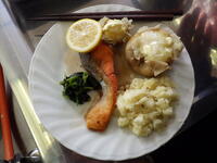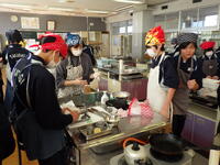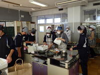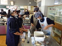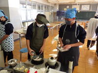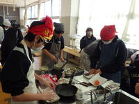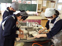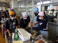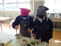 インフルエンザ等の感染対策を行いながら、「鮭のムニエル」を行っています。栄養教諭のサポートももらい手際よく作業を行っています。安全面・衛生面に注意しながら、調理した鮭のムニエルと付け合わせをおいしくいただきました。調理室からとっても良いにおいがしたので、思わず足を運びました。