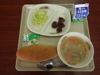 給食委員がお昼の放送で、各地の郷土料理について紹介しています。今日は宇都宮の姉妹都市「うるま市」のもずく丼、うちなーおでん、ちんすこうが出ました。ミネラル、食物繊維いっぱいのもずくの入った料理はのど越しが良く元気の出るメニューでした。明日は神奈川県横須賀海軍カレーです。楽しみですね。