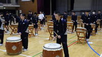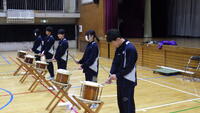 20人ずつ丸太鼓に向かい、足をしっかり踏ん張りながら演奏しました。生徒からは「おなかにずしんと響いてきました。」「リズムを取るのが難しかった。」などの感想が聞かれました。日常生活では体験できないことができたのでとっても良い体験活動になりました。関係の講師の先生ありがとうございました。
