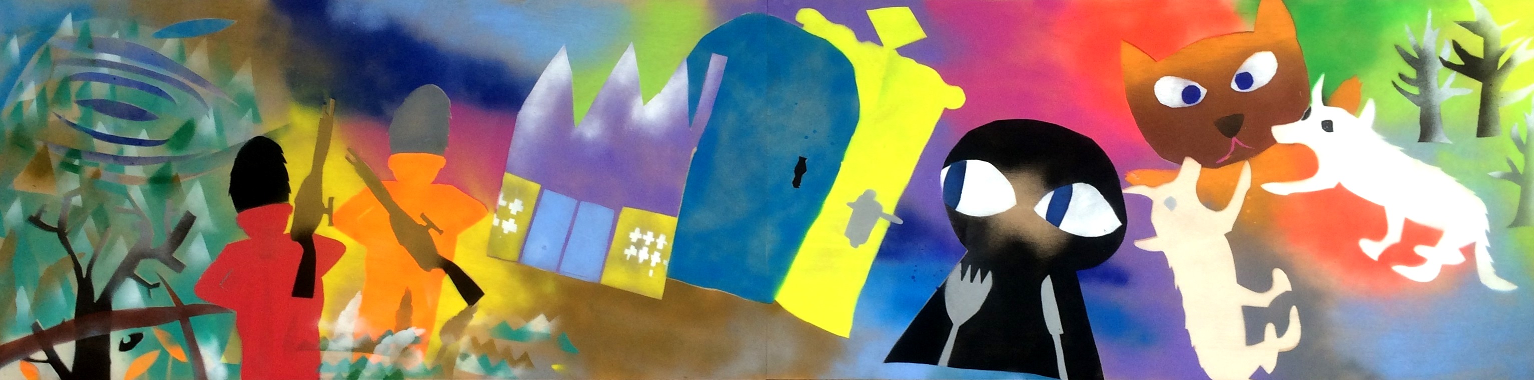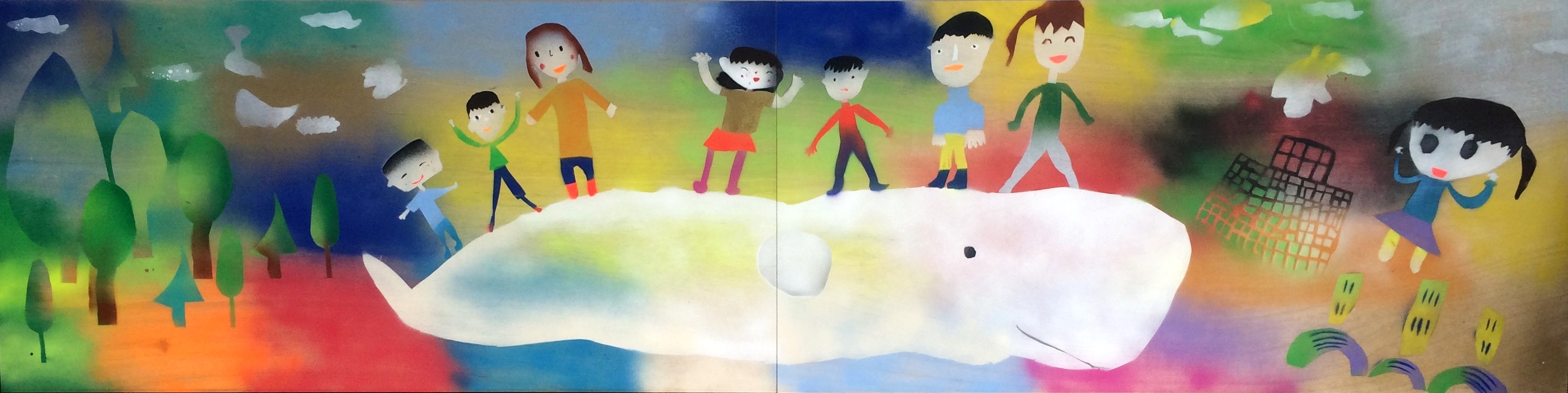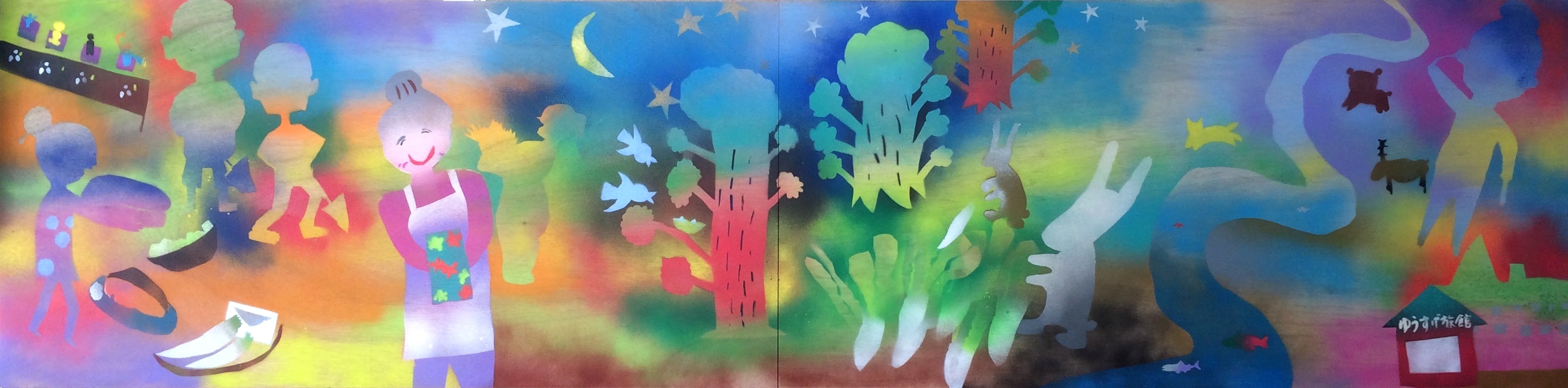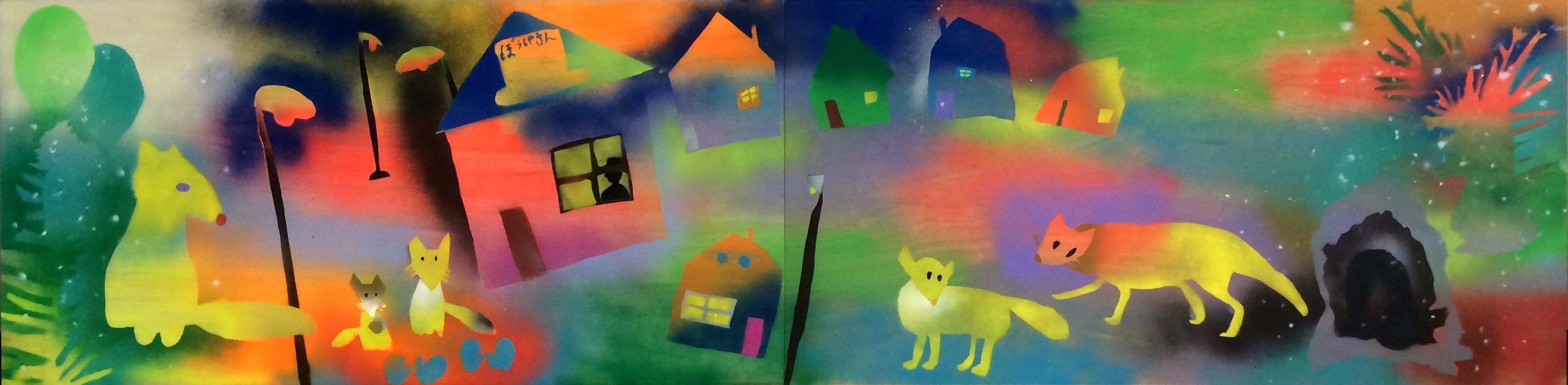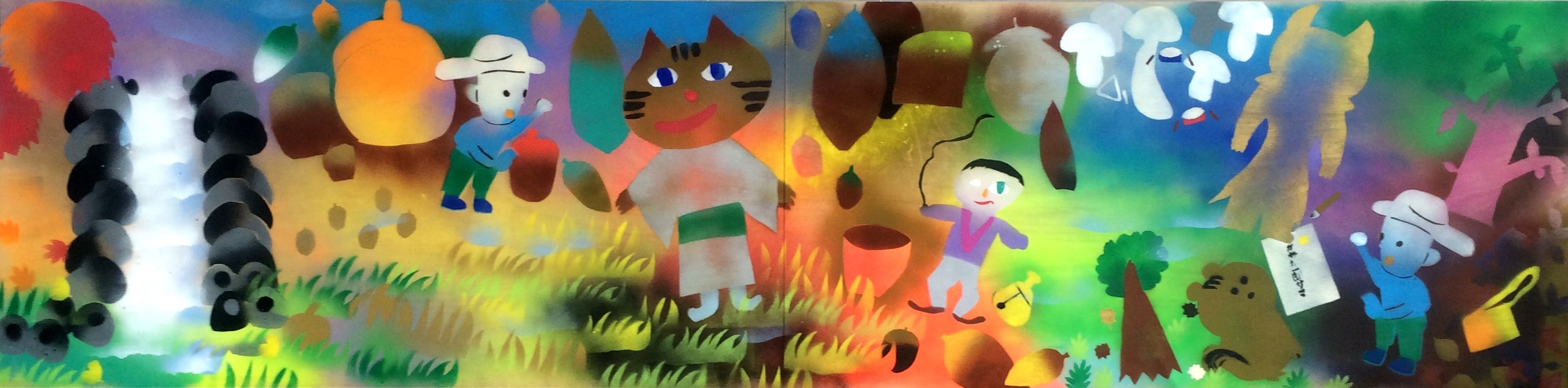 昨年(平成26年度)創立40周年記念行事として,1年生から6年生まで各クラスで2枚の大きなパネルにスプレーで絵を描きました。題材は,宮澤賢治の作品や教科書の題材でした。