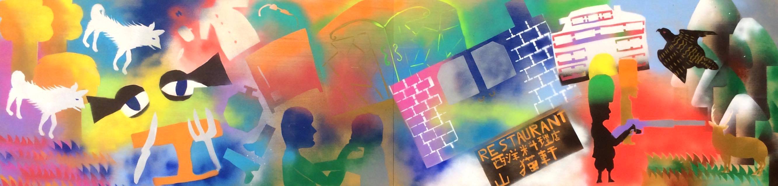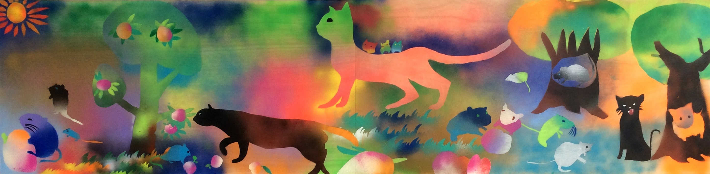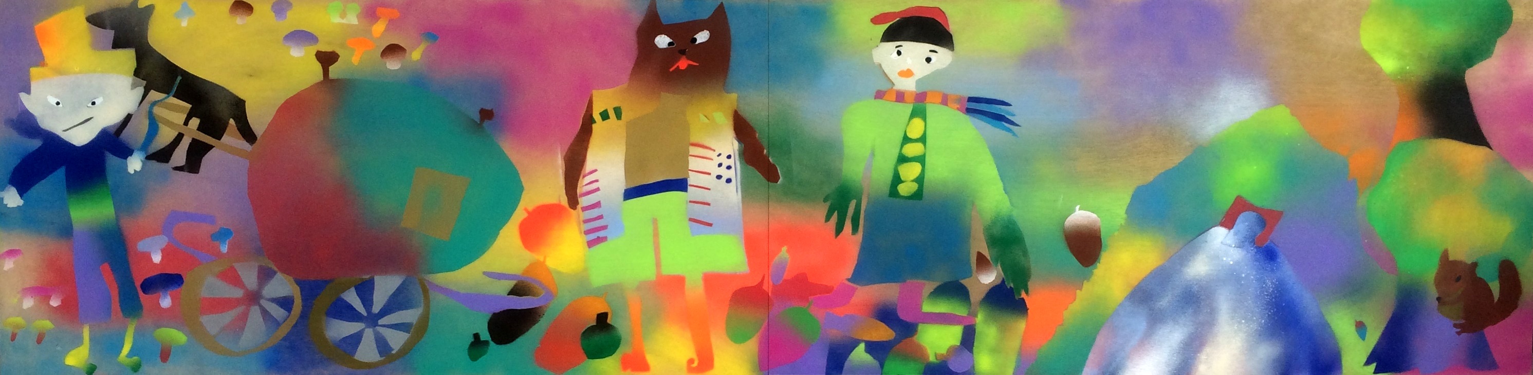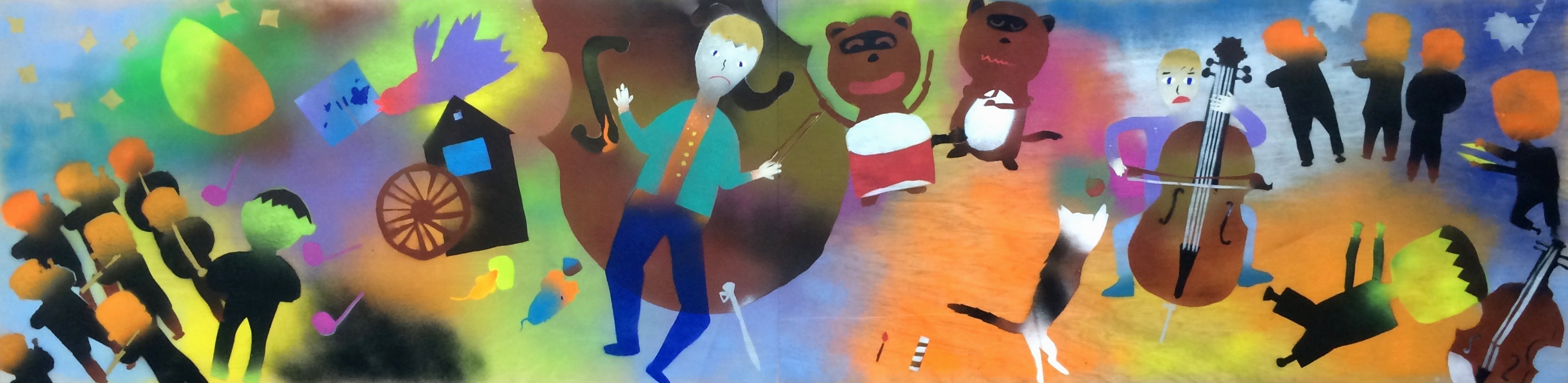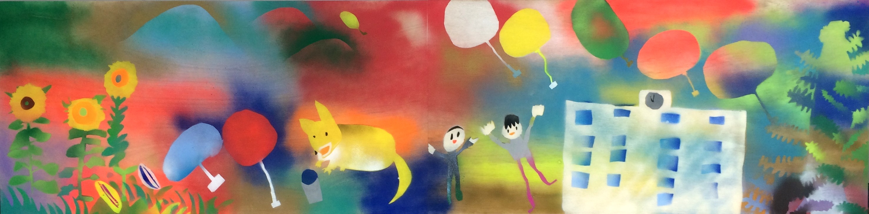 昨年(平成26年度)創立40周年記念行事として,1年生から6年生まで各クラスで2枚の大きなパネルにスプレーで絵を描きました。題材は,宮澤賢治の作品や教科書の題材でした。