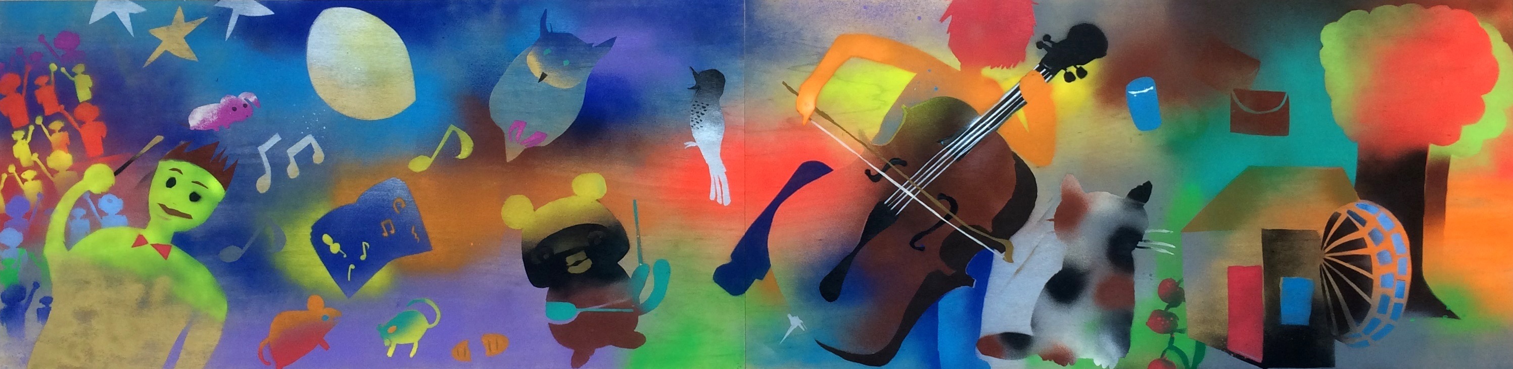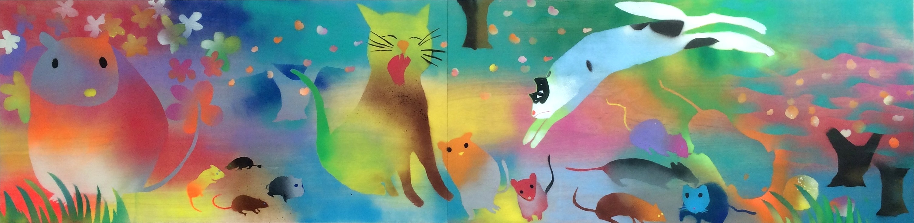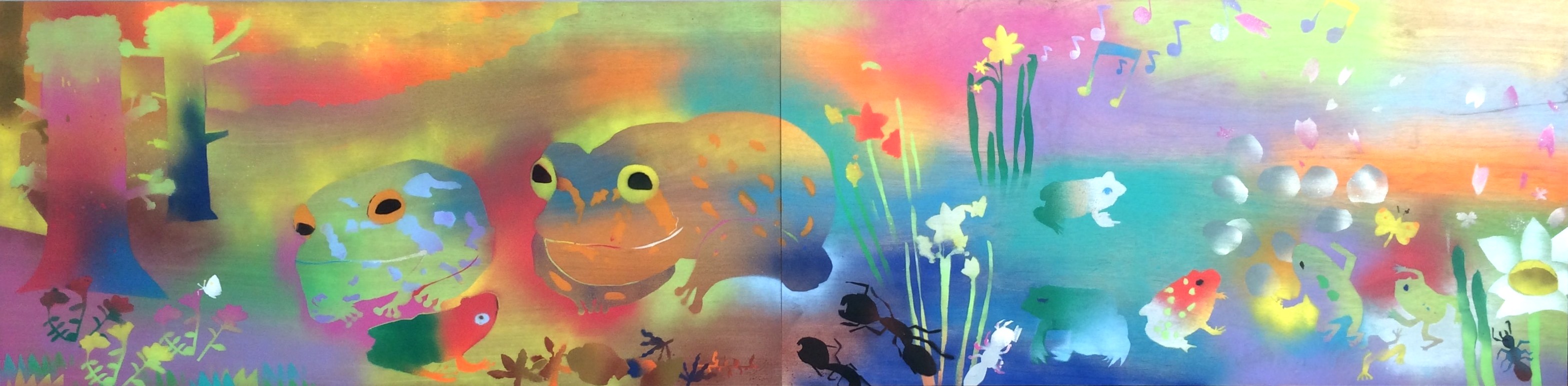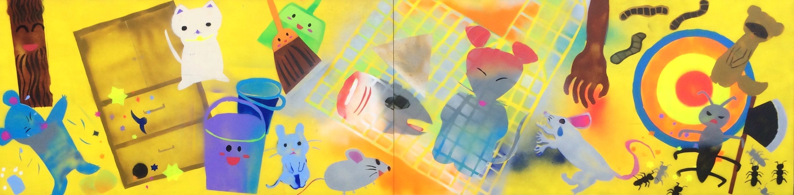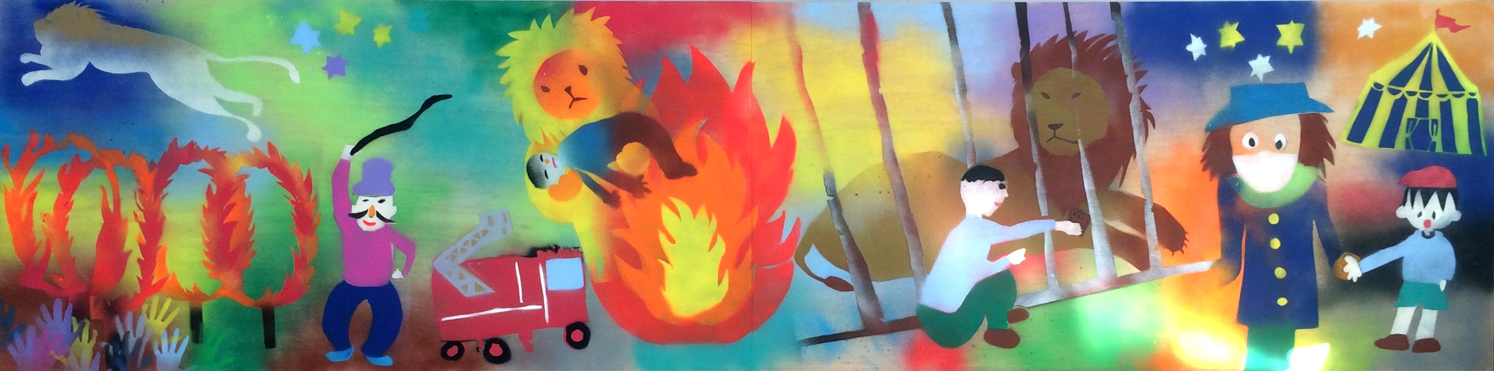 昨年(平成26年度)創立40周年記念行事として,1年生から6年生まで各クラスで2枚の大きなパネルにスプレーで絵を描きました。題材は,宮澤賢治の作品や教科書の題材でした。