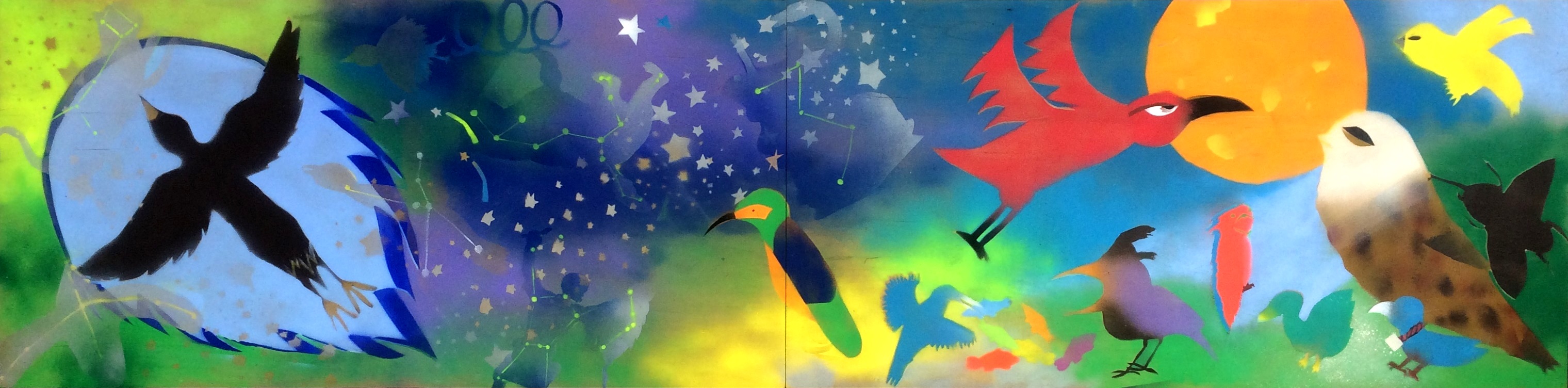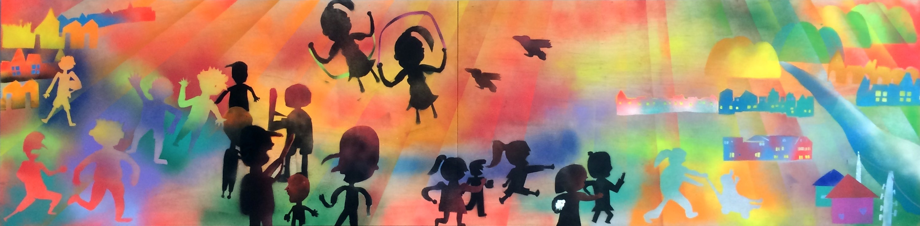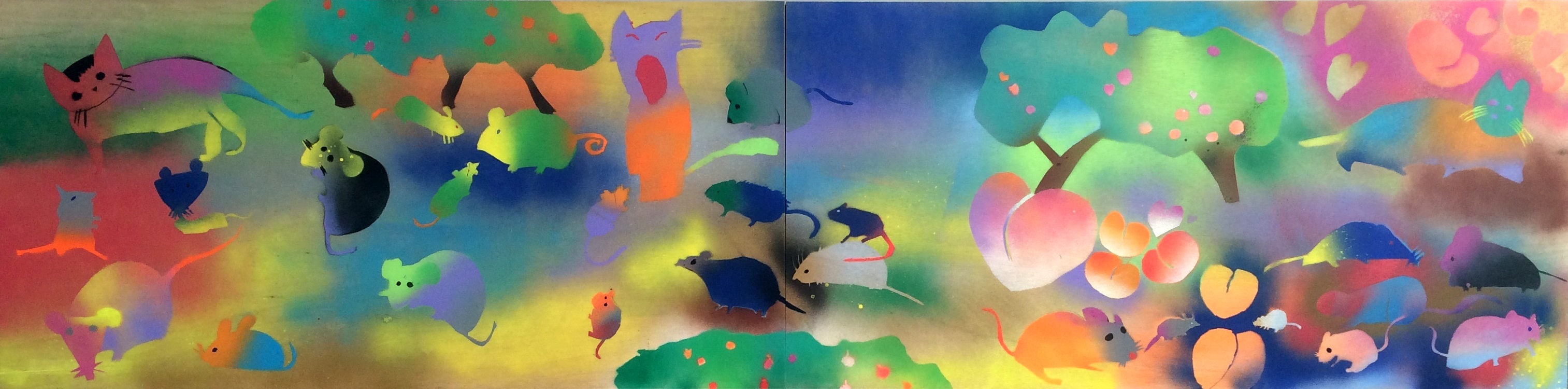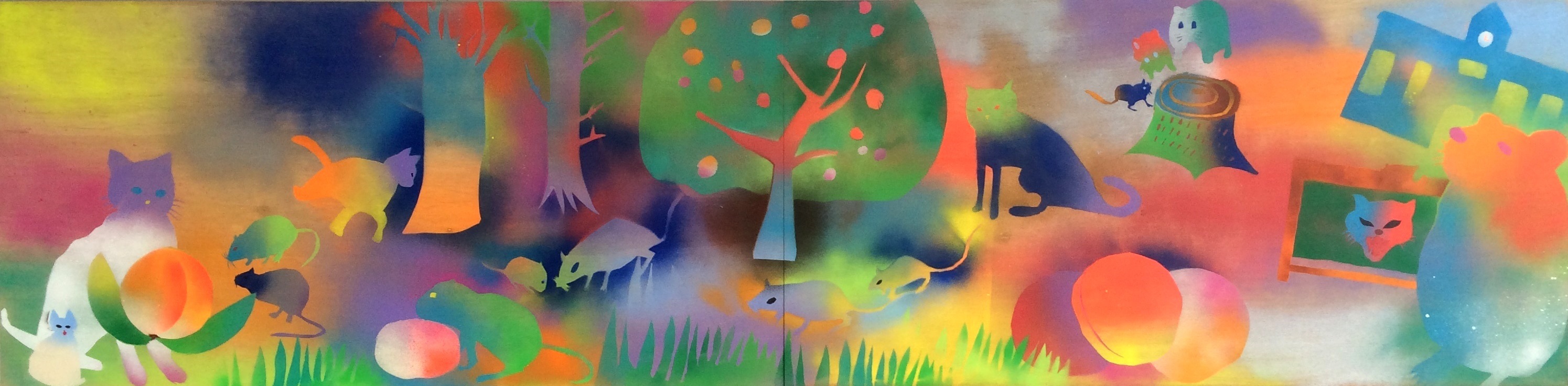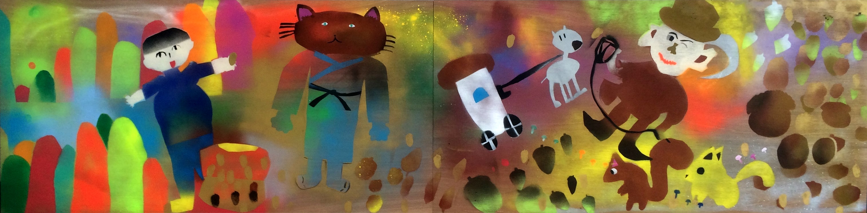 昨年(平成26年度)創立40周年記念行事として,1年生から6年生まで各クラスで2枚の大きなパネルにスプレーで絵を描きました。題材は,宮澤賢治の作品や教科書の題材でした。