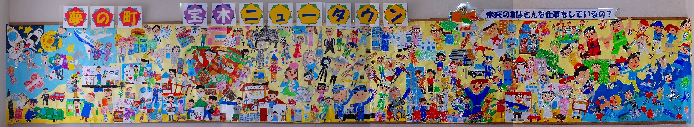 北校舎西3階6年生の教室のわきから南校舎3階音楽室をつなぐ通路があります。この北校舎側の通路の壁面を今回リニューアルしました。テーマは,「将来の夢~未来の君はどんな仕事をしているの」です。新しくできた夢の町 宝木ニュータウン,この町で働く人たちはさまざまな職業についています。6年生は,総合的な学習の時間に将来どんな職業についたらよいのか調べたり,さまざまな人から話を聞いたりします。職業学習のキャリア教育として,将来への夢を大きく膨らませる学習です。平成29年度3年生が宝木ニュータウンで働く人々と街を作り上げました。(制作平成29年度の3年生:3-1宮川学級,3-2大輪学級,3-3宇賀神学級)