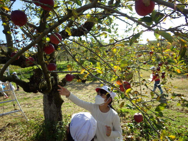 午後はりんご園に行き、りんごを2つ自分で収穫しました。色や大きさなどおいしそうなものを選んでいました。持ち帰ったりんごを食べてみたら、とてもおいしかったようで、次の日に学校で「おいしかった」と教えてくれました。1年生の楽しい思い出ができました。