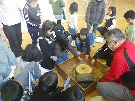 博物館の先生をお招きして,昔の道具の体験活動をしました。天秤棒を担いで昔の水くみの体験をしたり,石臼を回してきな粉をつくったりしました。他にもたくさんの道具にたくさんさわったり,説明を聞いたりすることができました。博物館では昔の道具の特別展をやっています。小学生は無料ですので興味がありましたら,ぜひ足を延ばしてみてください。