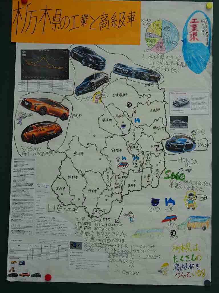 そこで,来年こそは少しでも魅力度ランキングを上げるためにも,私たちの住んでいる素敵な栃木県をもっといろいろな人に知ってもらいたいということで,栃木県についてより深く知り,さらにじまんをたくさん探して,それを宣伝する「栃木県ポスター」を作成することに決まりました。 グループごとに分かれ,時間をかけて一生懸命がんばり,栃木県の良さや特色,素晴らしさを紹介するポスターが出来上がりました。このポスターを見て,栃木県に興味をもってくれる人が増えると良いですね!