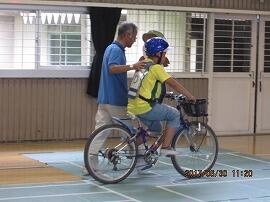 発進する時に確認すること,自転車の向きの変え方,自動車が止まっていた時の注意など,いろいろな場面を想定した実技試験がありました。