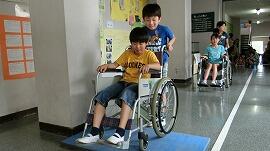 身長や体重を測る器具です。横になったり座ったりして測るそうです。実際に体験して測ってみました。見学の途中には,本を読んでいたり,運動会のポスターを貼りに行く練習を頑張っているわかくさ特別支援学校のお友達と会うことができました。