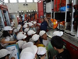 最後に,中央消防署に行きました。中央管理センターで,救急車や消防車を1台ずつ管理している様子や,画面に映し出された宇都宮市内の様子を見学しました。また,消防車や救急車の説明を受け,はしご車やポンプ車,レスキュー車の仕組みに,子どもたちは,興味をもっていました。消防服を着せていただき,「重いな。暑いな」と口にしながらも,とても嬉しそうな子どもたちでした。