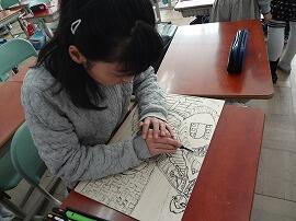 点描画制作を待っている間は,魚やクラゲなど海の生き物を,マジックペンを使って自由に描いていました。友達と見せ合ったり話をしたりして海の中を想像しました。