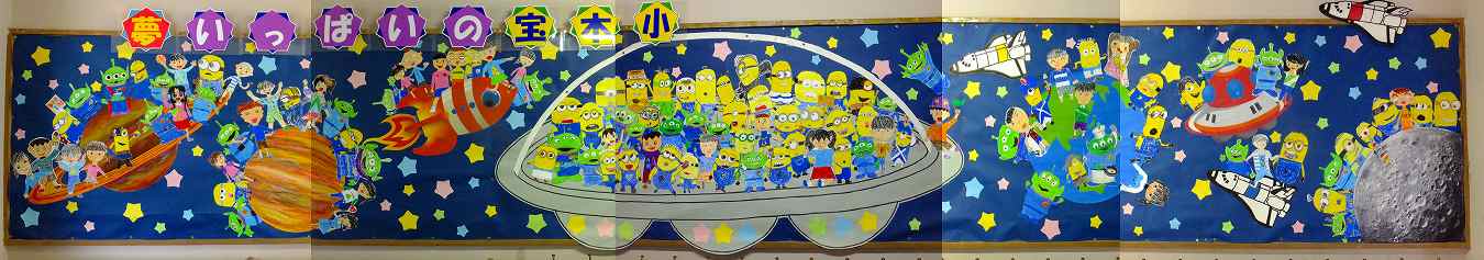 東昇降口から北校舎に入ると,1階の通路左手に見えるのが,この壁面です。「夢いっぱいの宝木小」のタイトルがついています。宇宙をテーマにした題材で,子供たち,ミニヨンとミスターグリーンマンが登場しています。UFO,ロケット,スペースシャトルに乗ったり,地球,木星,土星,月にも楽しい顔でまたがったりしています。(現在の5年生が4年生の終わりにみんなで一生懸命に作りました。)