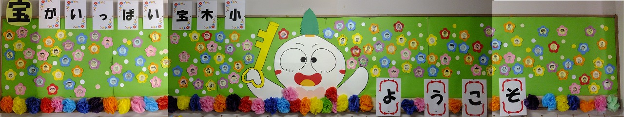 南校舎2階職員室側から北校舎に向かうと,陽だまりギャラリーという通路があります。その延に,タカラッキーをテーマにした壁面があります。この壁面は,宝木小には,キラキラ輝く宝物を持っている児童がたくさんいることを表しています。現在の4年生が制作したものです。