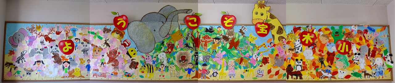 東2階には,フラワーロードと呼ばれる通路があります。北校舎側の通路の壁面は,たくさんの動物が集まって表現されています。春,夏,秋の季節の木に,たくさんの動物と子供たちが遊んでいます。大きなゾウとキリンが印象的です,りんごの実には,「よこうそ,宝木小」の文字が見えます。現在の6年生が3年生の時に制作した壁面です。