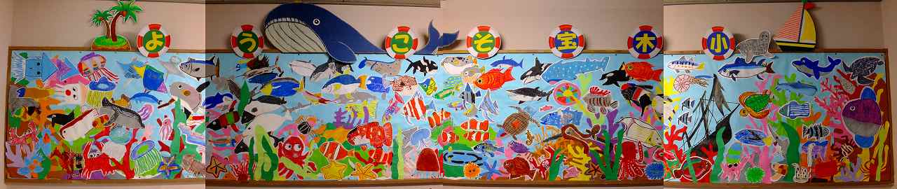 西昇降口から北校舎に入ってくると左手に見えるのがこの壁画です。水族館を思わせる壁画です。サメ,魚やたこ,イカなどたくさんの海の生き物が描かれています。美しいサンゴ礁の向こうに海底に沈んだ船が見えます。大きなクジラがゆうゆうと泳いでいます。「ようこそ宝木小」の文字は,7つの浮き輪にデザインされています。美しい海の生き物に会いに来てください。(現在の5年生が3年生の終わりに作りました。)