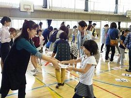 最初の車いす体験は,車いすのリレーです。バスケットボール用の車いすで,方向転換が素早く,子どもたちはくるくる回りすぎて,最初は戸惑っていました。すぐに慣れて,「もっとやりたい」と言っていました。