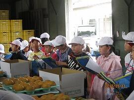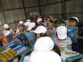 収穫した梨を仕分けるたり,箱詰めをしたりする作業場の様子も見させていただきました。子供たちは大きな梨を見て,びっくりしていました。