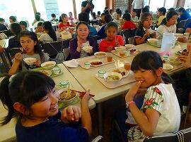 おなかペコペコで戻ってきた子どもたちを待っていたのは,おいしい昼食でした。最初の食事なので,手順がわからず,少し手間取りましたが,みんなおいしくいただくことができました。(メニューは,チャーハン,ミートボール,揚げ餃子,千切り大根のはりはりサラダ,ヨーグルト,お茶でした。)