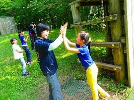 1・2組のイニシアティブゲームは,活動班の人が協力しないと達成できないゲームばかりです。ルールを活動センターの先生から聞いて,どのようにやろうかとグループで相談して作戦を立てました。もちろん,1回ではクリヤーできないようなものです。クモの巣,ウォール,ターザンなど何回挑戦してもなかなかできないものばかりです。失敗した時に,どうするといいのか話し合って何回も何回も挑戦して,やっと達成できました。「やったあ。できたあ。」という笑顔と歓声で盛り上がるゲームでした。