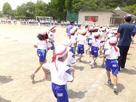 3時間目に第1回の運動会全体練習がありました。強い日差しから頭を守るために,体育帽をかぶり,その上からはちまきをして全体練習がはじまりました。今回は,開会式の練習をしました。初めは,元気よく腕を振って行進して入場しました。「腕は伸ばすとかっこいいよ。ももをもっと上げると元気に見えるよ。」と体育主任先生から指導が入りました。ラジオ体操の隊形に開く練習をしました。最後に,退場して座席に戻る練習をしました。