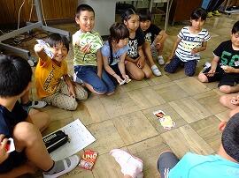 今日のタカラッキータイムは,初めてタカラッキー班(縦割り班)のみんなで遊ぶ日です。ロング昼休みに1年生から6年生までが班ごとに集まって遊びます。1班から10班までは体育館で遊びました。今日は天気が悪かったために,残りの班の人は全部教室で遊びました。いす取りゲームやウノ,ジェンガ,なんでもバスケットなどで遊びました。楽しい声や笑い声が体育館や教室から聞こえていました。